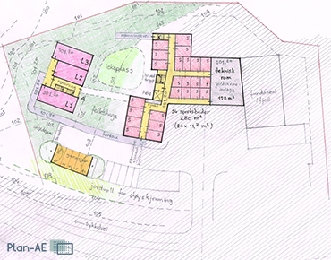 Næringsfunksjonene og helsetjenestene blir gruppert rundt et lite torg.