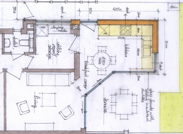 Skissen gjelder et tilbygg i grunnetasjen ved en eksisterende tomannsbolig. Tilbygget er planlagt i massivtre, mens det eksisterende huset er oppført i teglstein. Tilbygget er situert på sydøstsiden; store glassoverflater og horisontal solavskjerming ble foreslått for å utnytte solvarme i boligen. Glass skyvedører gir adkomst til en terrasse som er beskyttet mot vind.