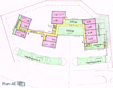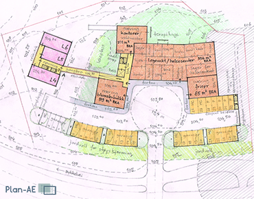 Næringsfunksjonene og helsetjenestene blir gruppert rundt et lite torg.