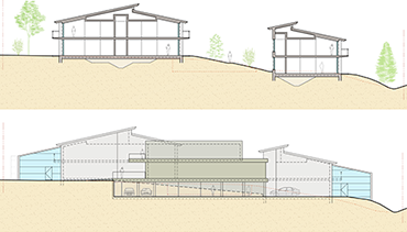 Bygningen følger den naturlige terrengskråningen, ved at den høyre fløyen er plassert ett etasjenivå lavere ned i terrenget enn den venstre fløyen. Bruk av miljøvennlige byggematerialer blir vurdert.