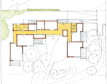 En idéskisse for åtte boenheter med omsorgsservice. Boarealene er orientert mot hagen, mens fellesrommene har utsikt over adkomstarealet.